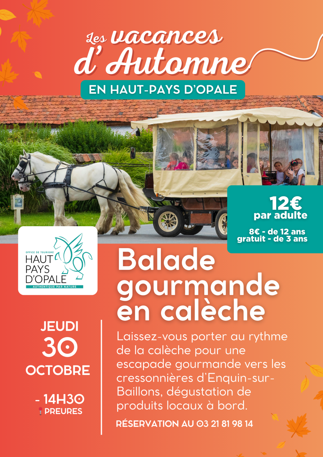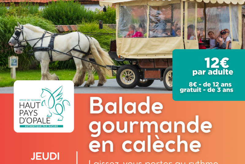À propos Tarifs Retour à la liste Embarquez pour une aventure pittoresque à la découverte de la Vallée de la course, ses moulins, ses cressonnières… Admirez les paysages tout en dégustant les délices de notre terroir, directement à bord de notre calèche à assistance électrique. L'Office de Tourisme Haut-Pays Côte d'opale vous invite à une balade en calèche gourmande qui fera de vous des spécialistes du territoire. Tarifs Tarif Min. Max. Tarif de base - Adulte Plein tarif 0€ 12€ Tarif enfant 0€ 8€
