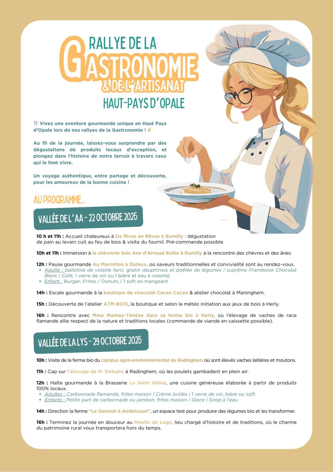 2 À propos Tarifs Retour à la liste 🎉 Rallye de la Gastronomie - Vallée de l'Aa - 29 octobre 2025 🎉Amoureux de bons produits et de découvertes locales, rejoignez-nous pour une journée inoubliable à la découverte de la Vallée de l'Aa ! Au programme, des saveurs authentiques et des artisans passionnés vous feront découvrir les trésors culinaires de notre belle région.📅 Programme de la journée :Le rallye démarrera à 10 h au campus agro-environnemental de Radinghem. La journée passera ensuite par l’élevage de M. Debuire, la Brasserie Le Saint Gilliet pour un déjeuner 100 % local, puis par Le Germoir à Ambricourt, avant une conclusion tout en douceur au Moulin de Lugy, haut lieu d’histoire et de traditions. Venez savourer un moment unique de convivialité, au cœur de notre terroir ! 🧀🍯🍫📍 Inscrivez-vous vite au 03 21 81 98 14 Tarifs Tarif Min. Max. Tarif 0€ 30€