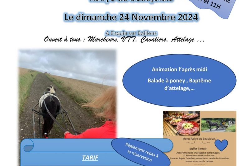 À propos Retour à la liste Les écuries du Ménage organisent un Rallye du Beaujolais, le dimanche 24 novembre 2024Au programme : balade à poney, baptême d'attelage, marche, balade VTT, balade à cheval et en calèche. Repas. Information et réservation au 06 20 63 34 31