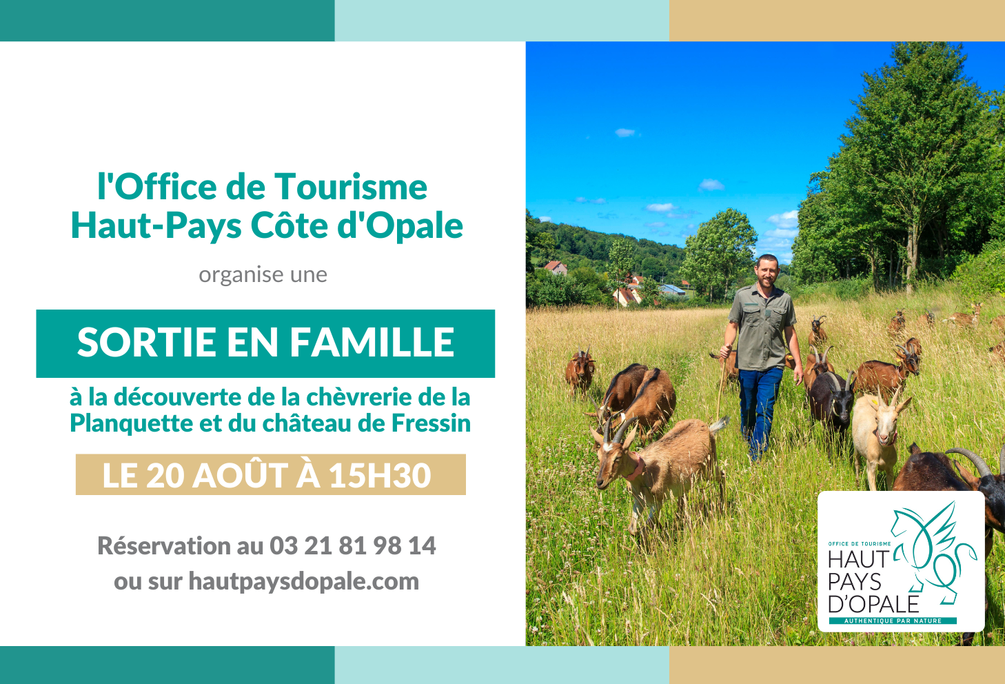 À propos Retour à la liste L'Office de Tourisme Haut-Pays Côte d'Opale vous invite à participer aux sorties en famille en Haut-Pays d’Opale ! Ce dimanche 20 août 2023, partez pour une après-midi riche en découvertes, au programme : visite de la chèvrerie de la Planquette et du château de Fressin. Les activités de la chèvrerie et le passé tumultueux des Sires de Créquy n’auront plus de secret pour vous.RDV à 15h30Tarif : 5.00 €Sur réservation