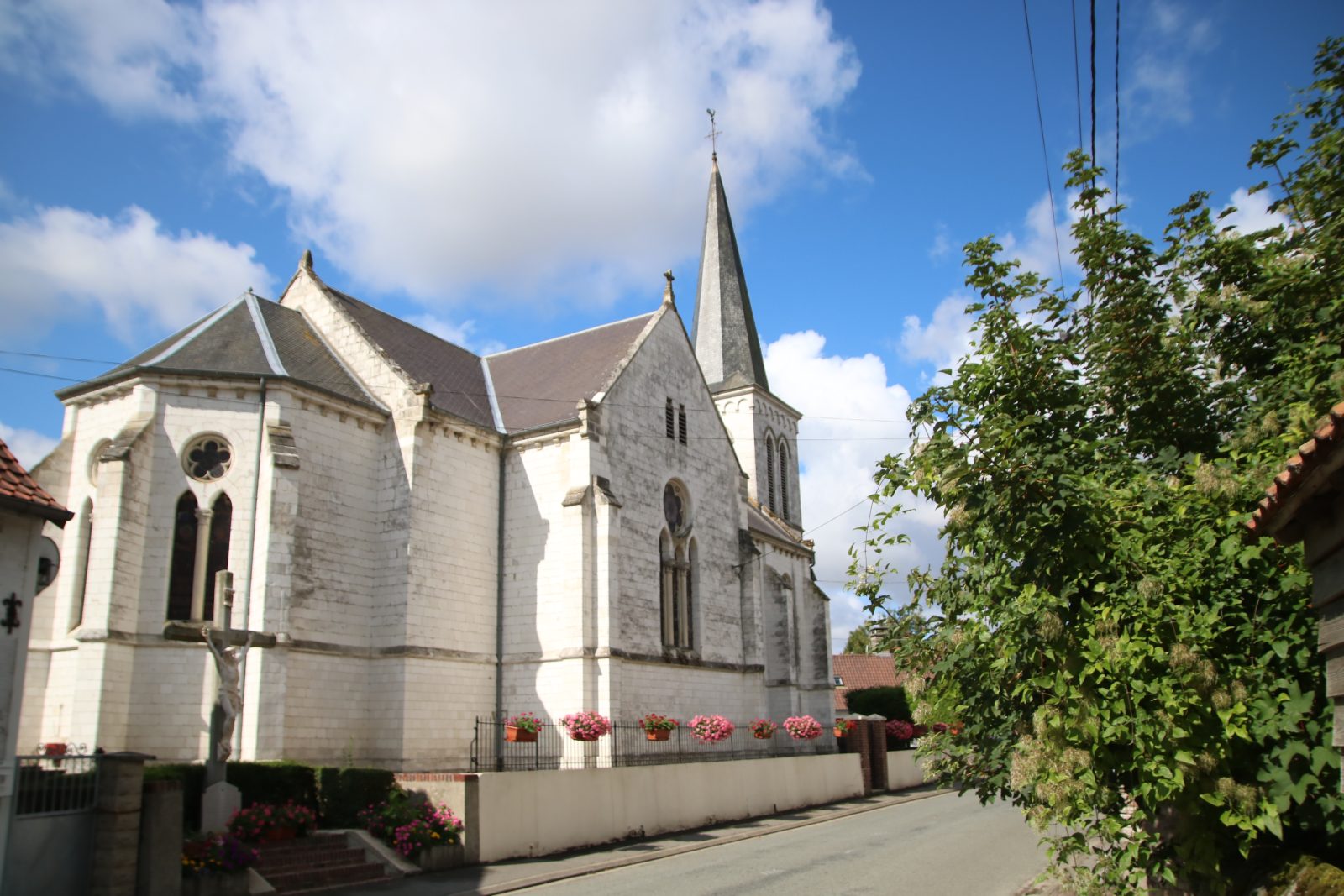 2 À propos Retour à la liste Bâtie sur les fondations de l’ancienne église qui s’est écroulée en 1873, l’église de Beussent a été construite par l’architecte hesdinois Clovis Normand, qui s’est inspiré du style architectural de Violet Leduc. Dédiée à Saint-Omer, l’église présente quelques spécificités comme ses baies à deux ou trois formes surmontées d’un oculus polylobé qui font référence aux modèles architecturaux du XIIème siècle.